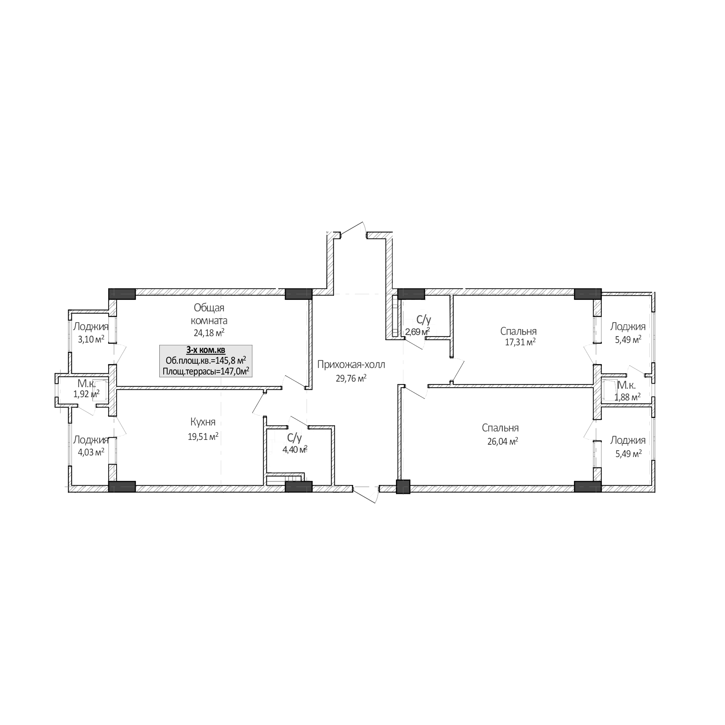 3-комн. Квартира 145.51 м² в ЖК «Тавхид Молл»