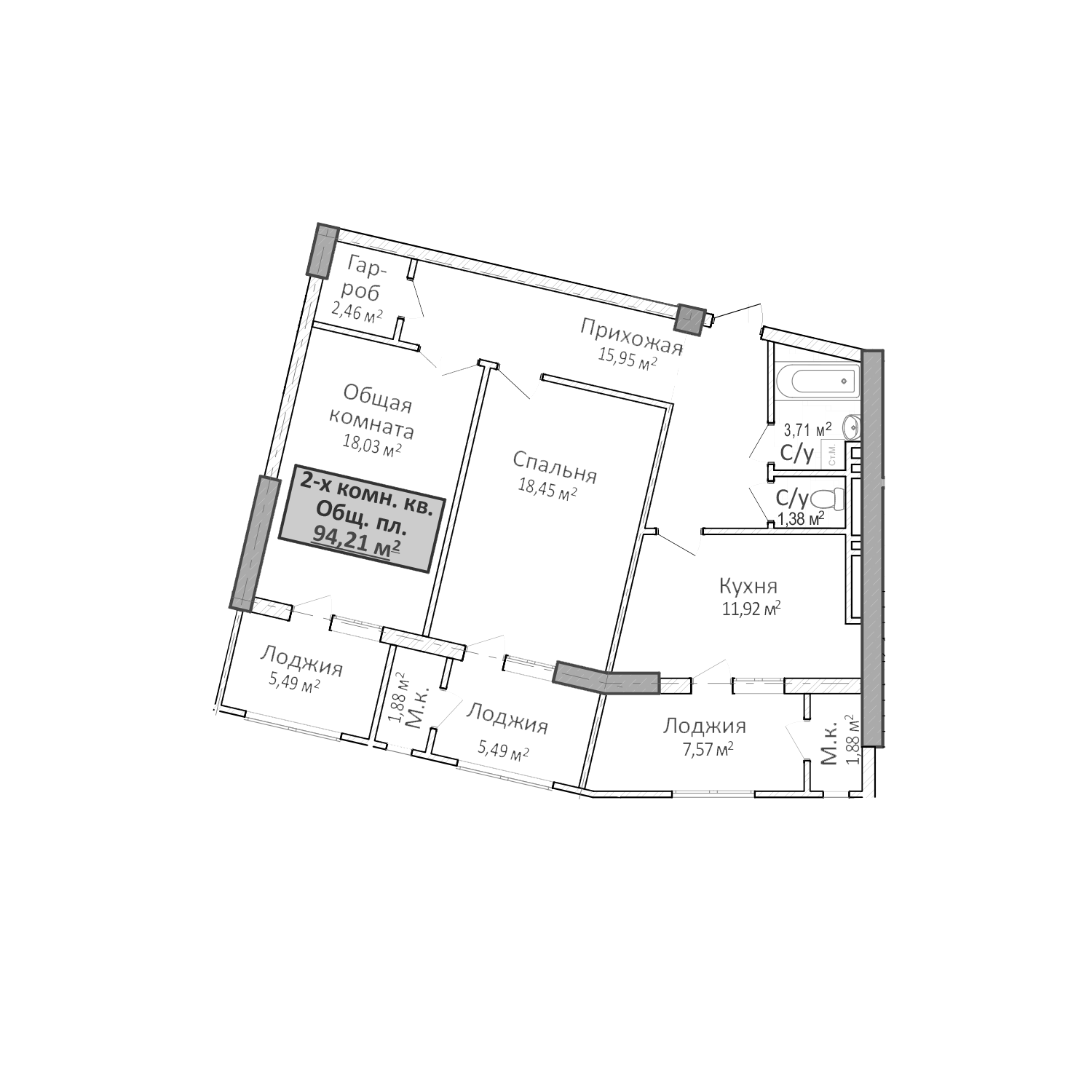 2-комн. Квартира 94.21 м² в ЖК «Тавхид Молл»